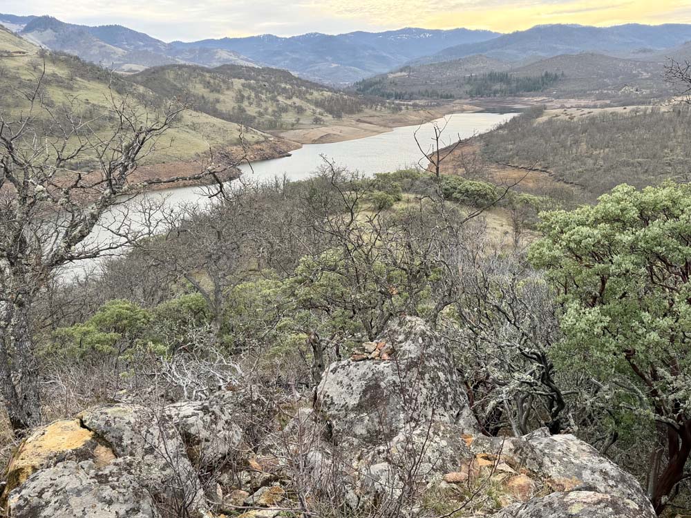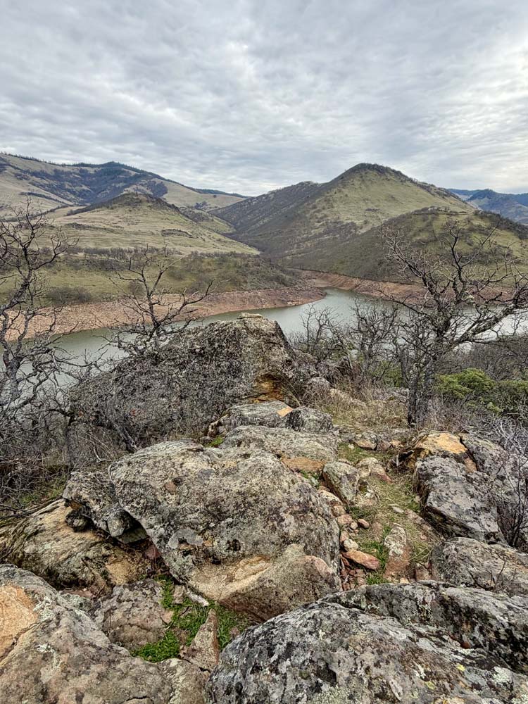 The loop journey took us back along a narrow trail against a heavily eroded lakeside (paying close attention not to slip off the edge). The trail continued into the wooded area where we discovered grass widows, our first wildflowers of the new year, and then proceeded down along the lakeshore where the trail opens to views south to Pilot Rock. We passed through the meadow and across the hillside used to teach and practice paragliding. On this last stretch, we passed through a great deal of rose hip bushes and “snow ball” bushes (for want of a proper name).