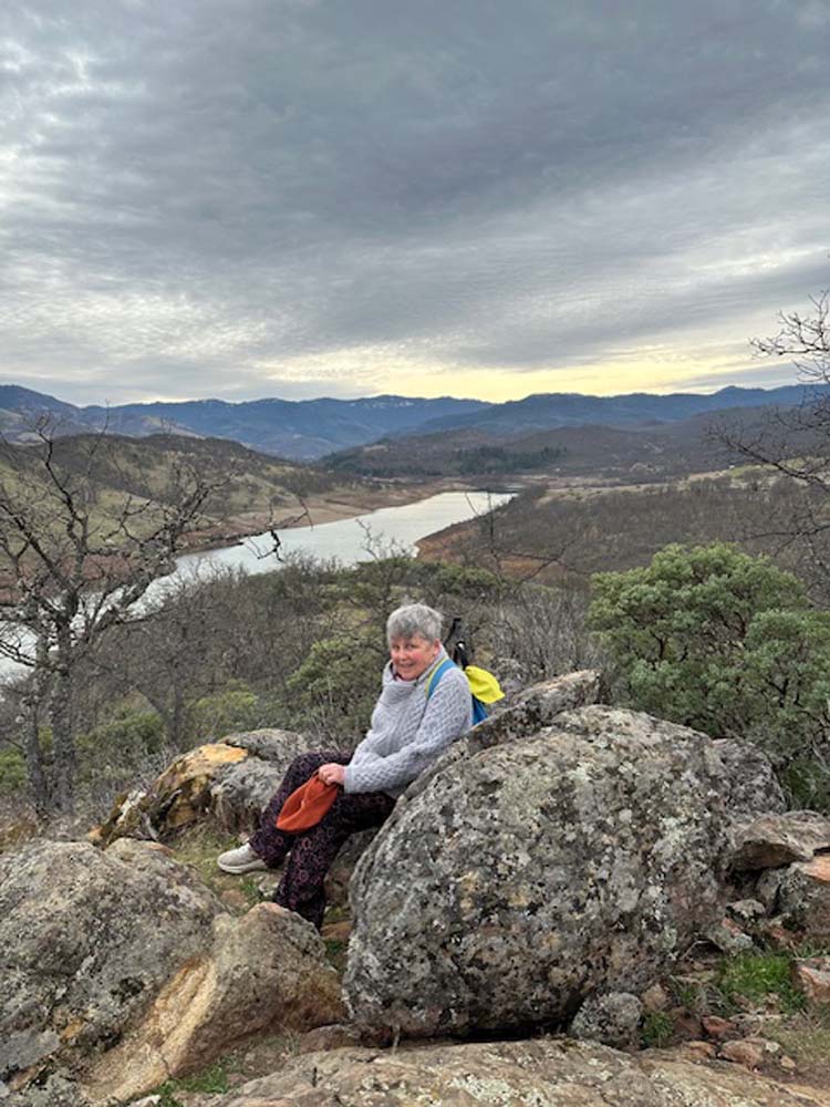 We came to the upper finger of Emigrant Lake and headed westward to climb to Little Songer Rocks, always a treat for a break. We proceeded down the trail to the lakeside where we had lunch perched on the ‘beach’ rocks and logs.