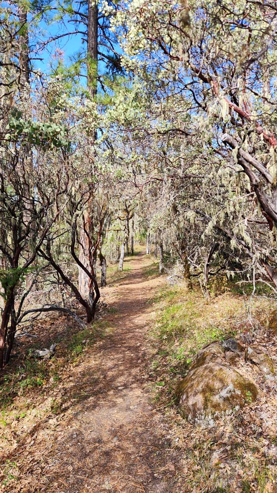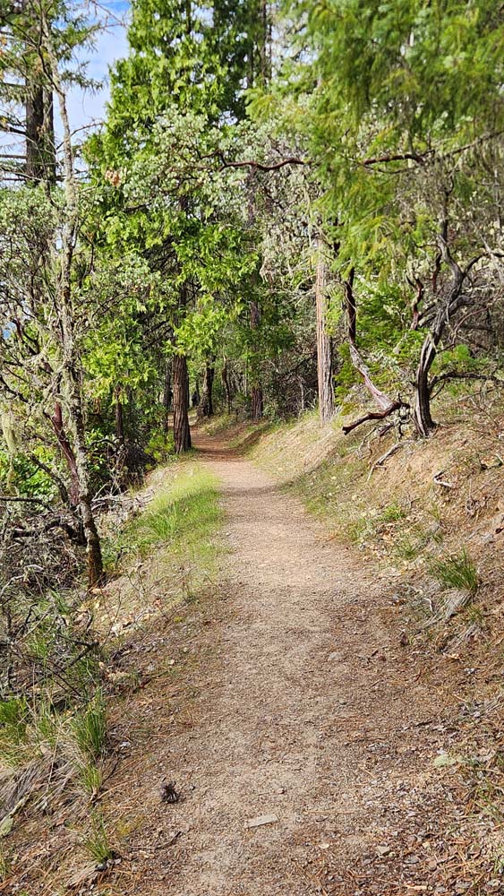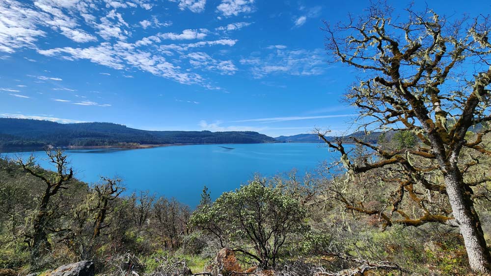 The trail down from the trailhead goes through forests of Madrones, Manzanitas, and White Oaks, with views of the Lake in open spaces.