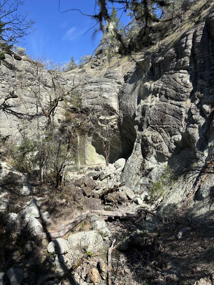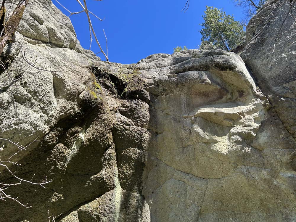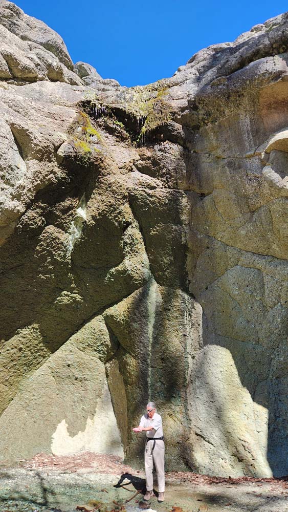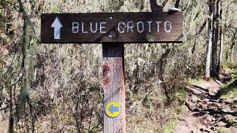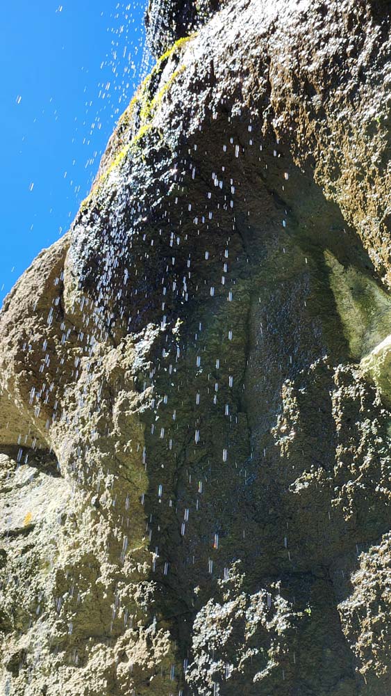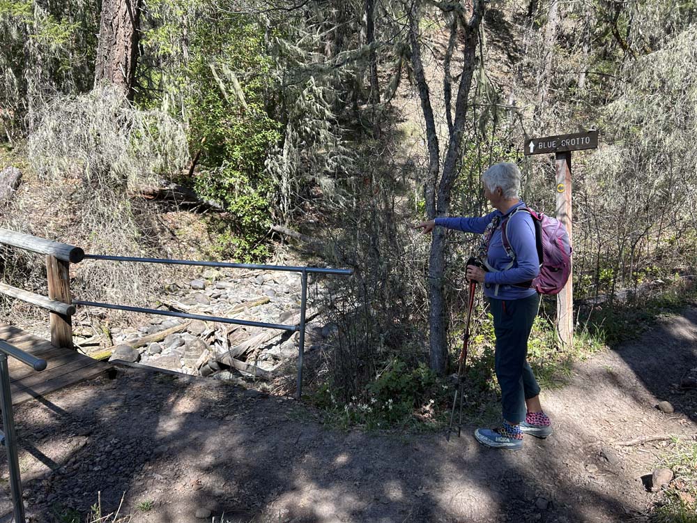 We arrived at the sign for Blue Grotto just before noon and took the rocky but dry trail up to the Grotto. The seasonal waterfall was mostly done, with just a trickle and drops falling into the small pond at the bottom.