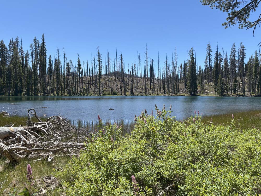 Rather than heading up to Isherwood Lake as in past years, we decided to return 0.3 miles on the Cold Springs trail to the isthmus between the Heavenly Twin Lakes. The smaller twin lake on the south side of the trail presented on the edge of the burn area, so the view southward showed mountains covered with burned evergreens. The larger twin lake on the north side was set amidst healthy green evergreens and underbrush. We enjoyed the beautiful view across this large lake toward mountain ranges with Luther Mountain and the most distant Devil’s Peak on the horizon. Some of us spotted an Eagle circling above the lake.