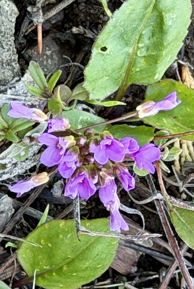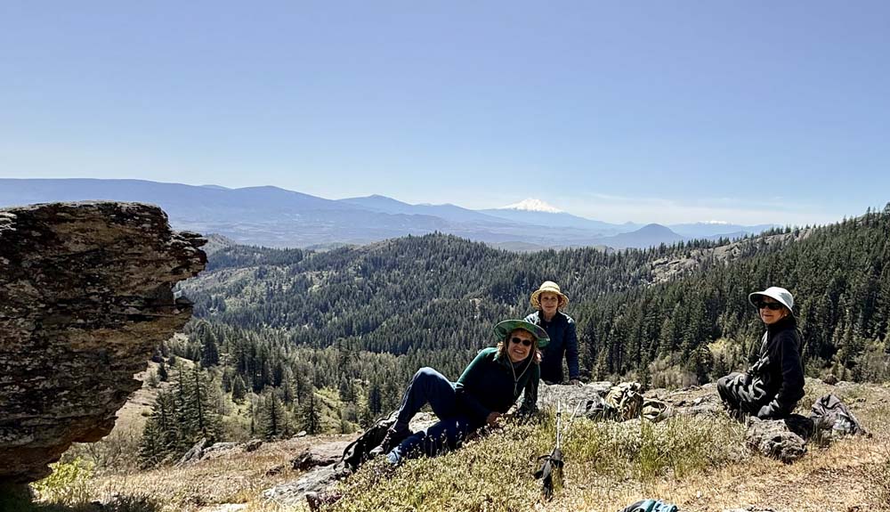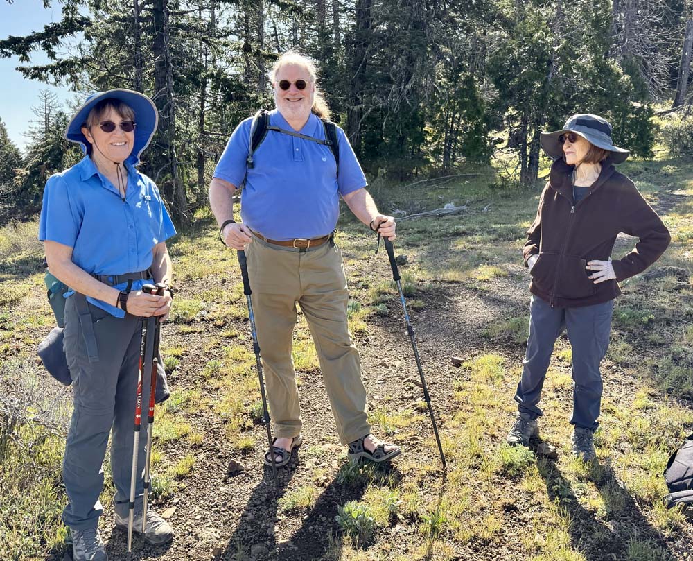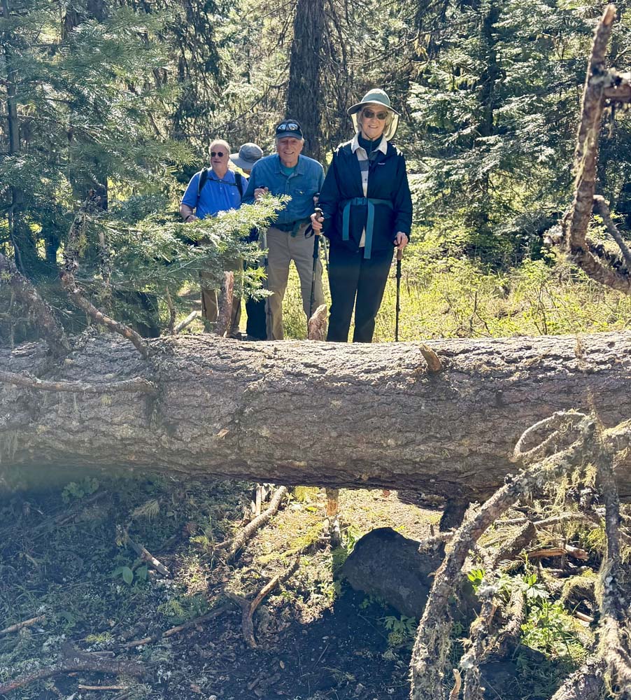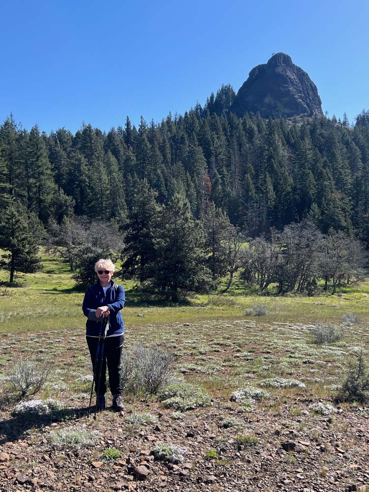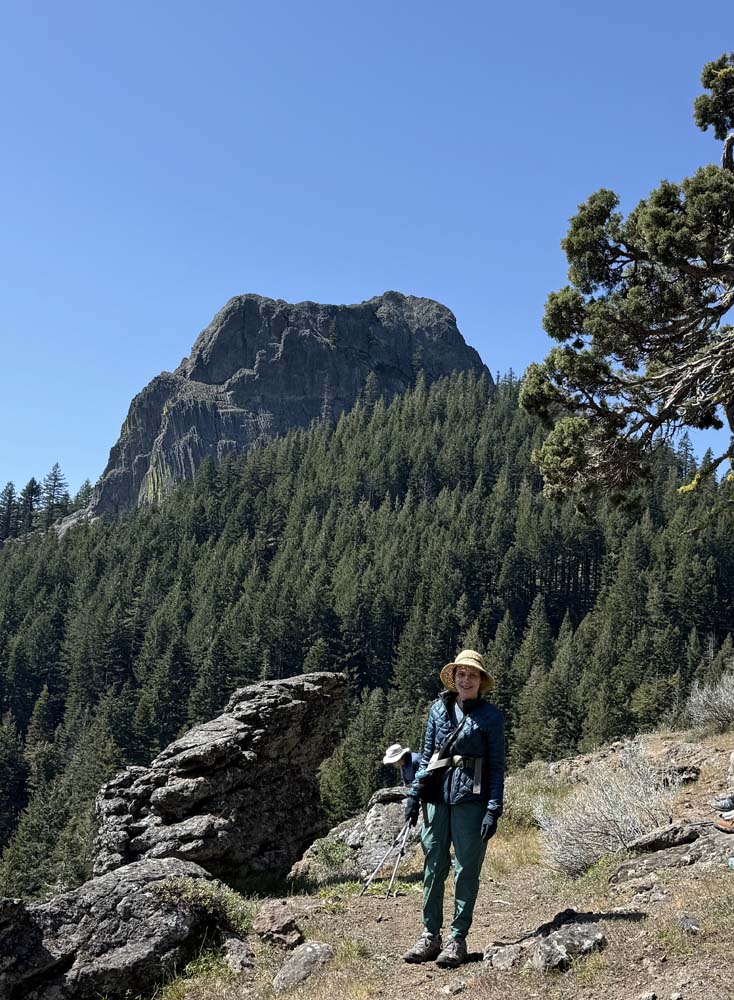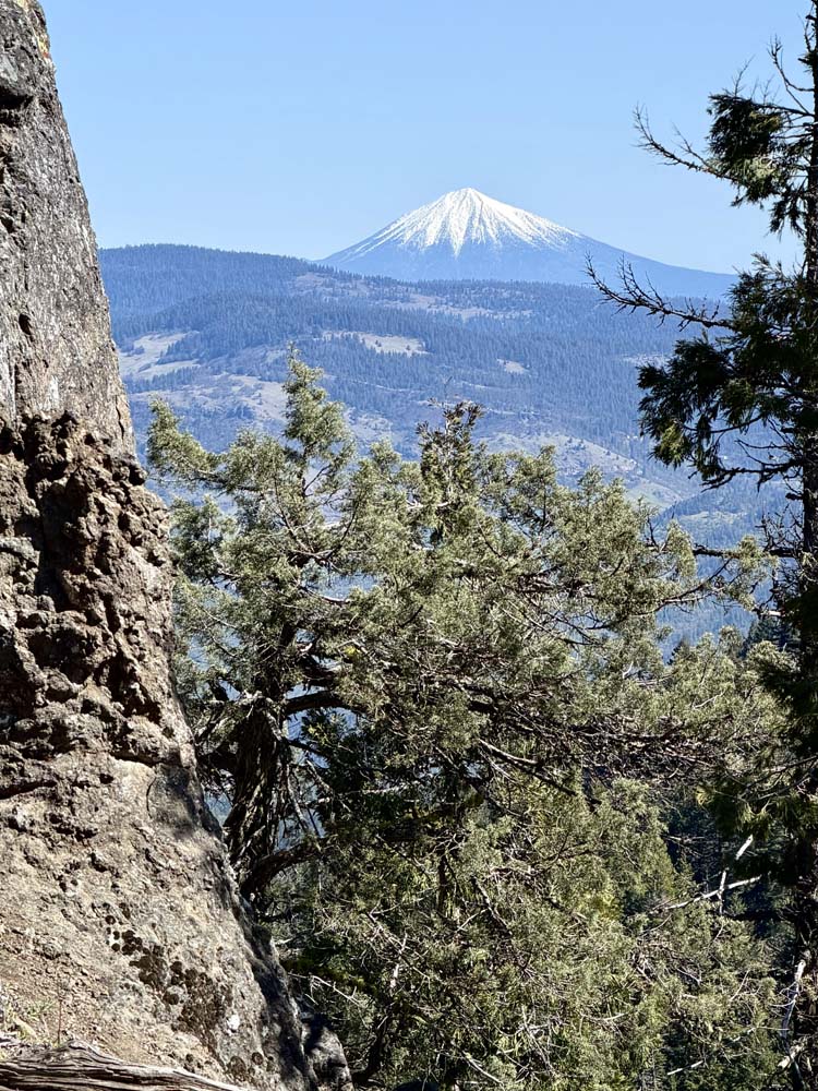 Kay led the others down the PCT for a mile to the open vista towards California. Phlox, daggerpod, paintbrush, and other wildflowers were blooming in the open area. The group then returned up the PCT to the overlook for Pilot Rock.  There were 5 fallen trees across the trail that we could easily climb over.  We had excellent views of Mt. McLaughlin and then Mt. Shasta.