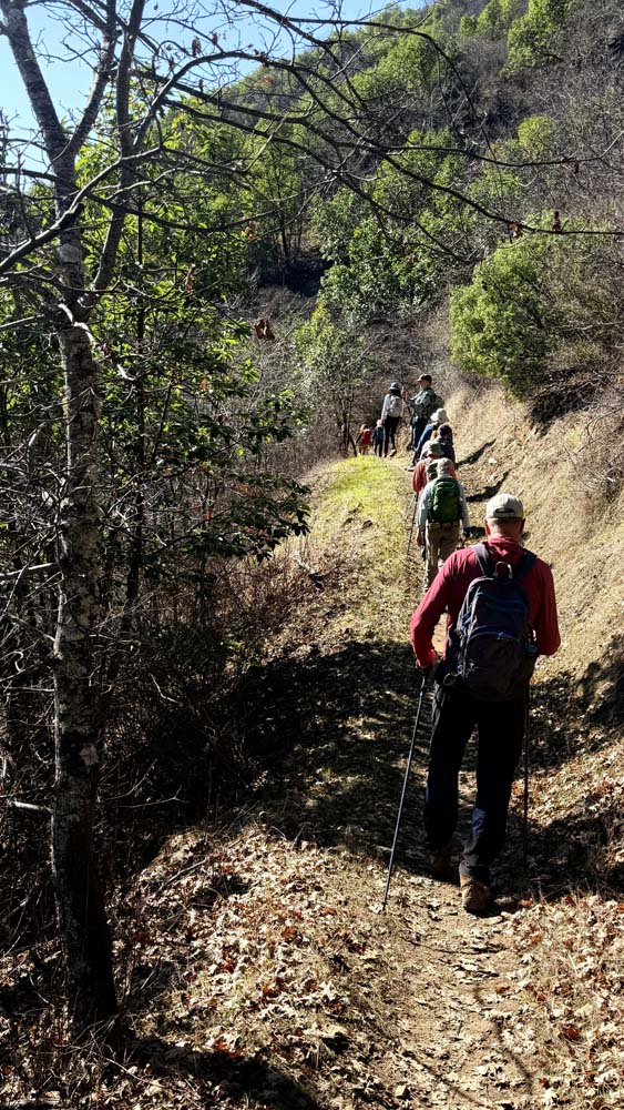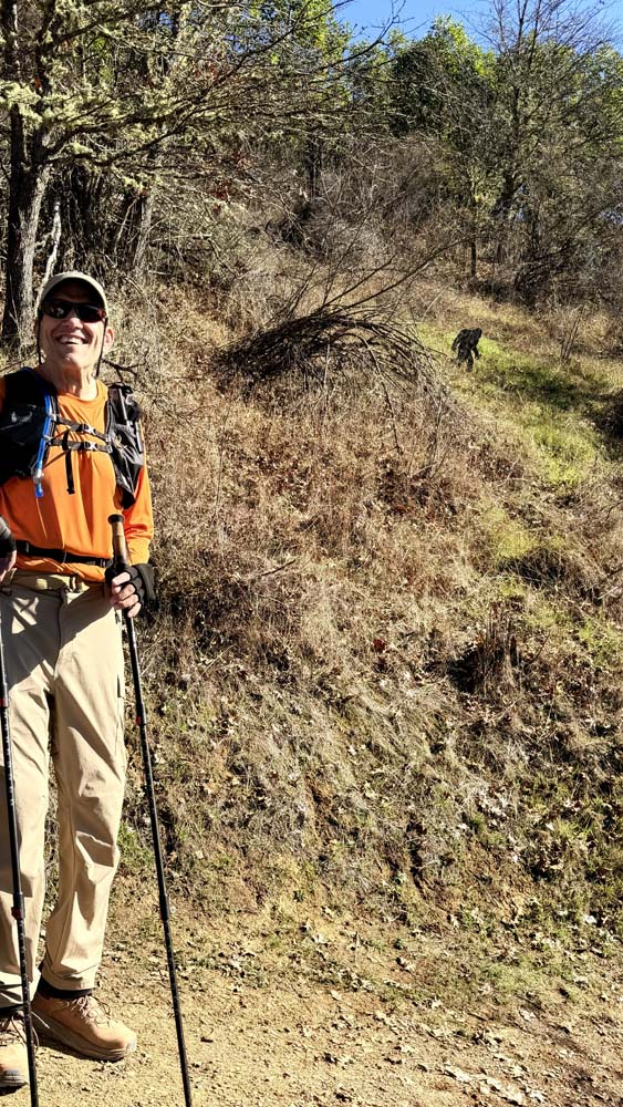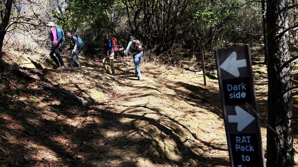 After lunch, our return was a rolling descent back down the Darkside Trail, with a short connection to the upper end of the Rat Pack Trail—bringing us to our meetup with the Sasquatch Trail. What a great photo opportunity for a first-time group photo with a Sasquatch! Once again, the trail opened to wide views, with frequent switchbacks to ease the descent, eventually reconnecting with the Rat Pack Trail all the way back to the parking lot. With temperatures in the mid-60s and full sun, the warmth of the day had us all hiking in our shirt sleeves.