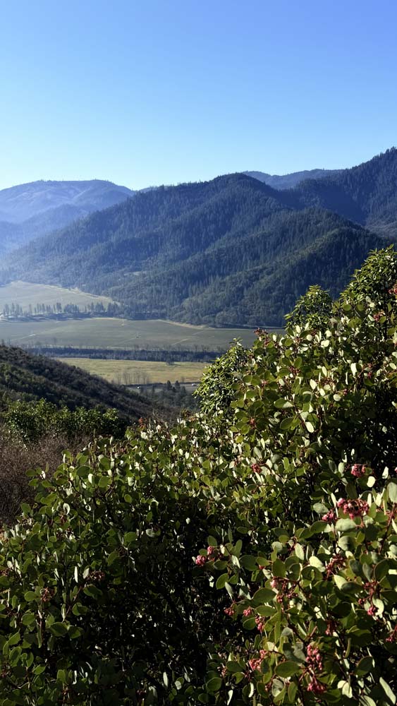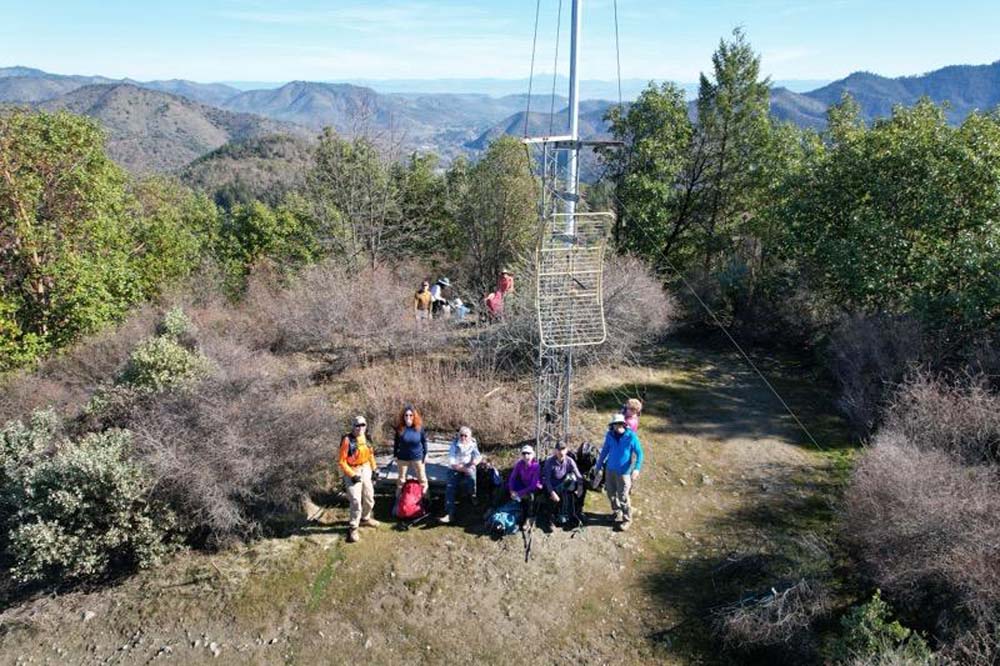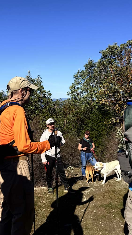The trails follow an easy, graded ascent with frequent switchbacks. We started out on the Rat Pack Trail, hiking through groves of madrone, manzanita, and other deciduous trees and shrubs. Gradually, the trail opened up, and we found ourselves basking in sunshine with expansive views of the surrounding mountains and valley for much of the climb. Shortly before reaching the summit, we connected with the conifer-forested Darkside Trail, which then joined the Tin Pan Peak Trail. Upon reaching the peak, the group voted to make it our lunch spot—it was noon, and the location offered wonderful views of both the valley and the mountains to the southwest, with Mount McLaughlin visible to the east.