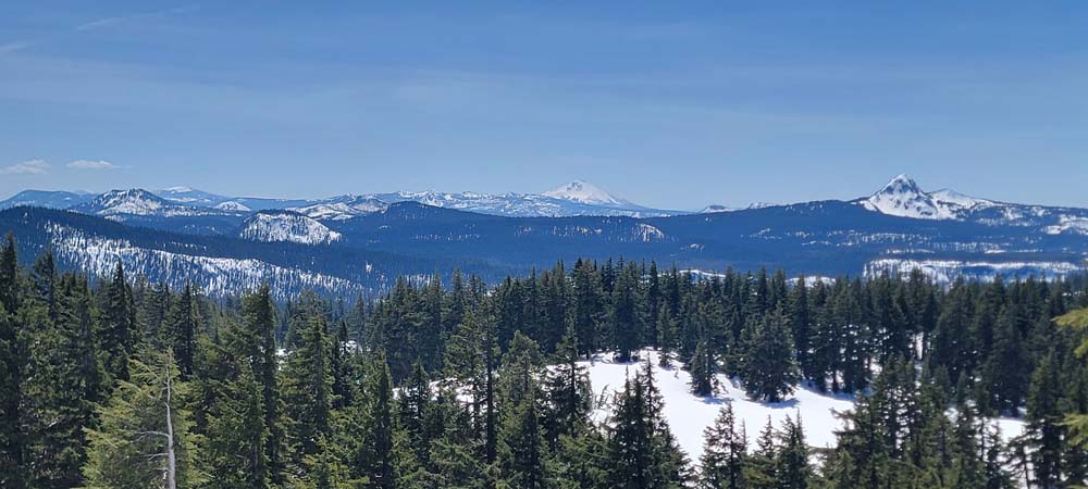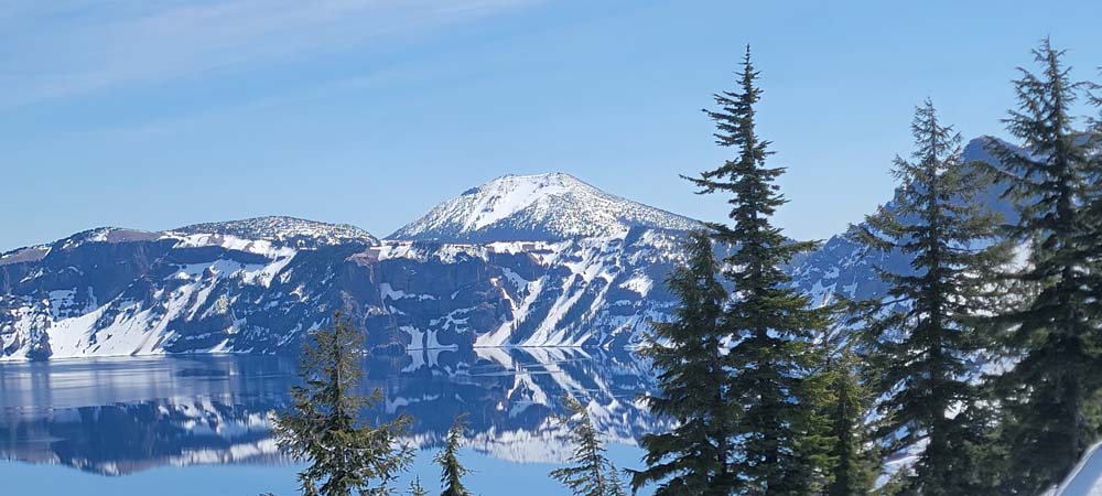 The sky was mostly blue and there were a few clouds. To look at the lake and see the reflections was amazing. We could see Mount Thielsen in the distance. The snow was well packed because many people have been traveling on it throughout the year.
