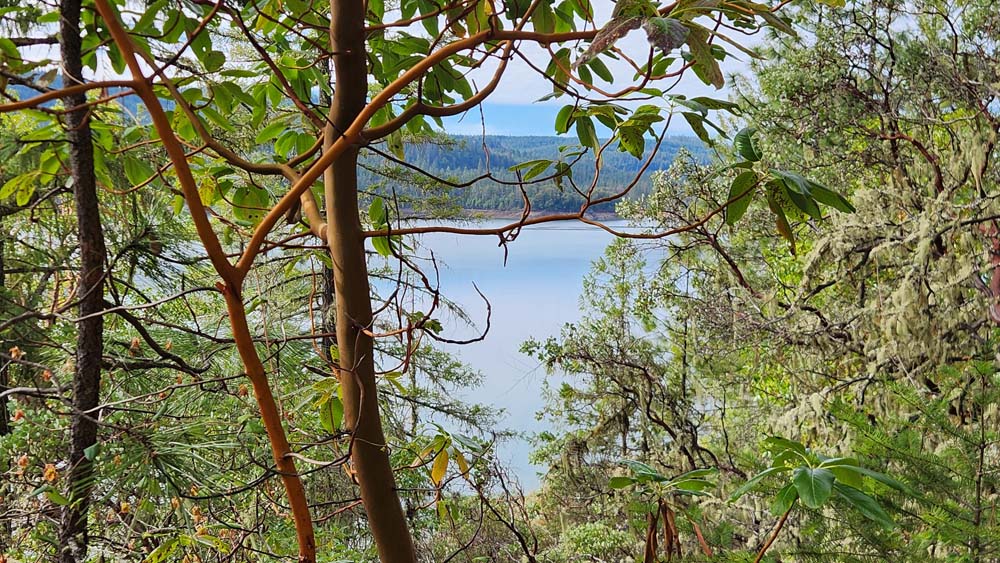 The trail down from the trailhead goes through forests of Madrones, Manzanitas, and White Oaks, with views of the Lake in open spaces.