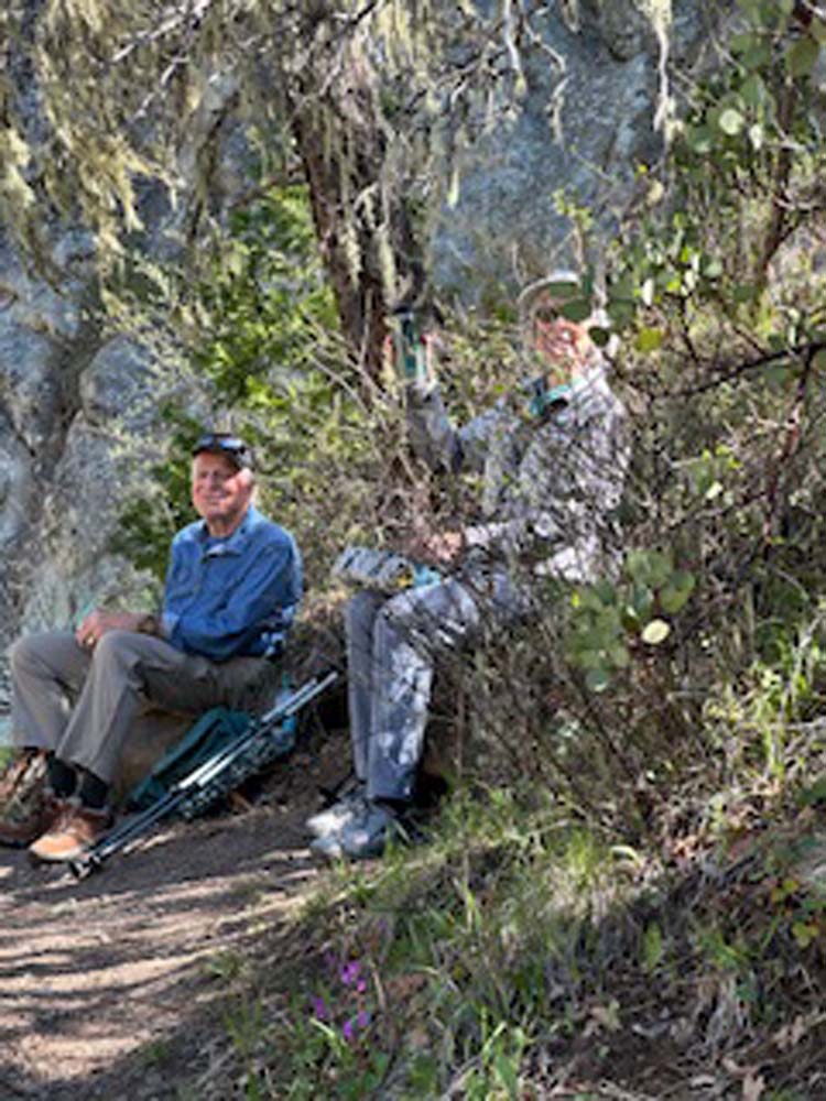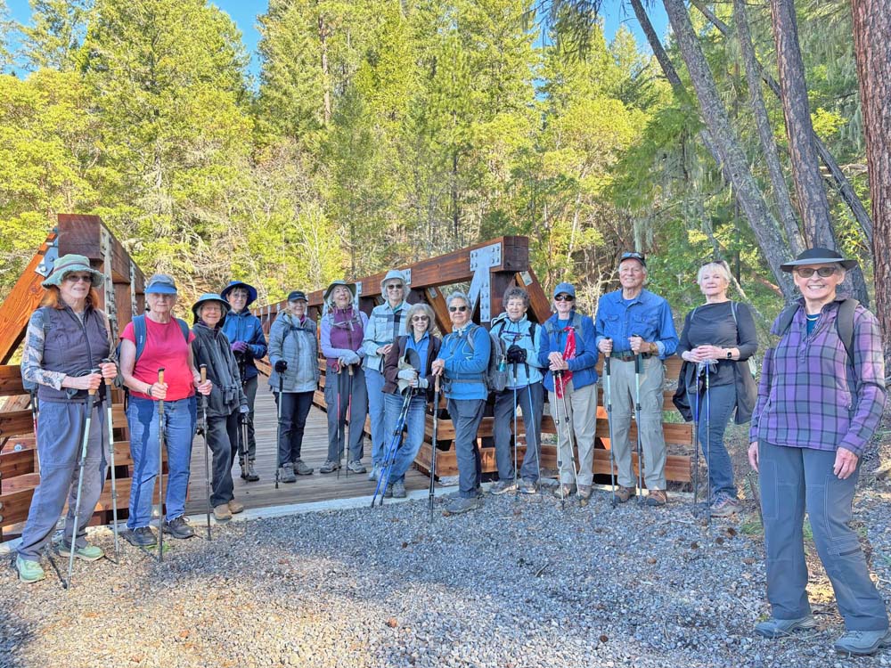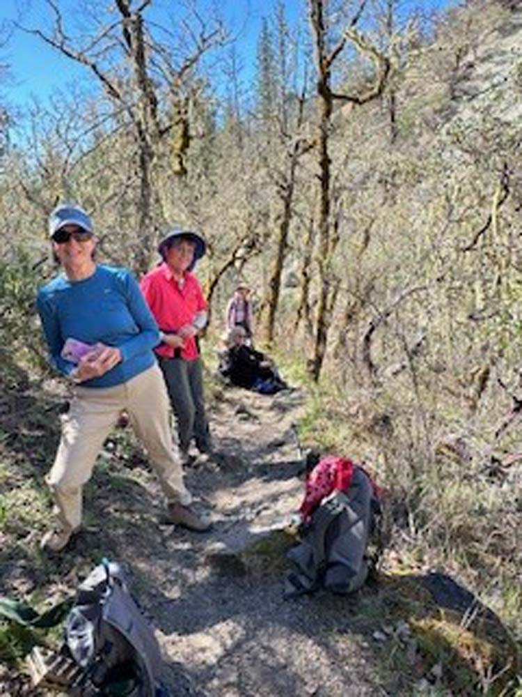 Fourteen of us met up at Ashland CVS and then stopped to rendezvous with those in Medford at Fred Meyer gas station lot. We were happy to welcome Lynn to our group. We headed up to Lewis Road TH where we began our hike in the open forest of Douglas fir, ponderosa pine and black oak. We crossed the old bridge to Fire Glen Camp for a stop and visit. Continuing beyond the beach area, we ventured along a cliff of lava boulders to delight in the great views on a sunny day. When we reached the relatively new, beautiful bridge, Elisabeth stayed put to take care of her Achilles tendonitis. Alison and Sue picked up to lead. When they reached the intersection with the rocky climb to the Blue Grotto, all but three climbed up to the Grotto to see if there was water falling off the cliffs. We’d heard from Monday group hikers who did the same journey that the falls were non-existent. More moisture must have developed in the meantime, because our group was regaled with a showy waterfall. Poison oak was very abundant, including 5-6’ stands, but it was not yet hanging onto the trail. We enjoyed the early spring wildflowers, with shooting stars most abundant. We saw blooming Oregon grape, purple flowering hounds’ tongue, fawn lily, and more, but finding some red bell fritillaria was the most thrilling. The hike was about 5 miles RT with 150’ elevation gain without counting the climb to the Grotto.