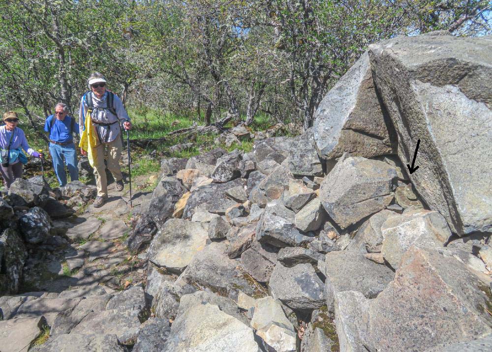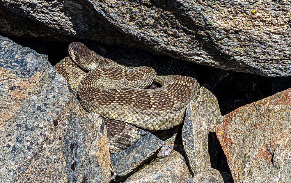 Then we hiked back across the summit to the lookout facing south with a great view of Mt McLoughlin. This lookout is raised up on a rocky outcropping and in one of the crevices heading back down the steps we met a Rattlesnake with her rattle shaking! After we got over being startled, we learned why she was warning us to stay away. She had her offspring with her in the rocks.