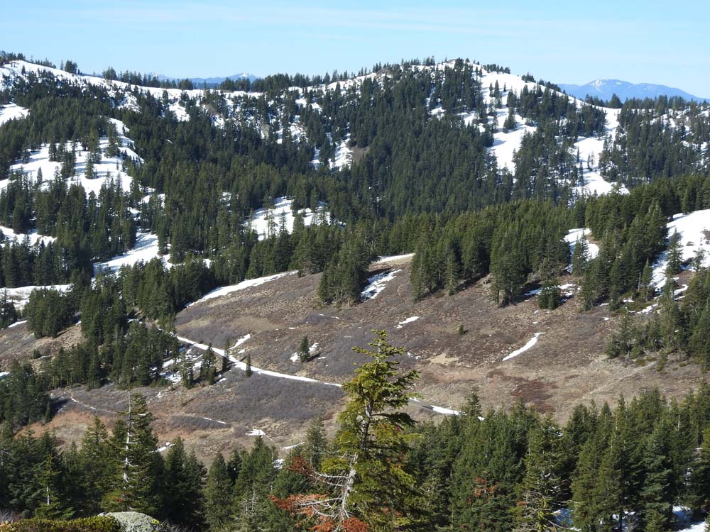 With the recent end of the ski season, we moved up our hike on Mt. Ashland while there was still some snow remaining. There was no need for snowshoes, but Yaktrax and spikes helped to negotiate the icy patches.